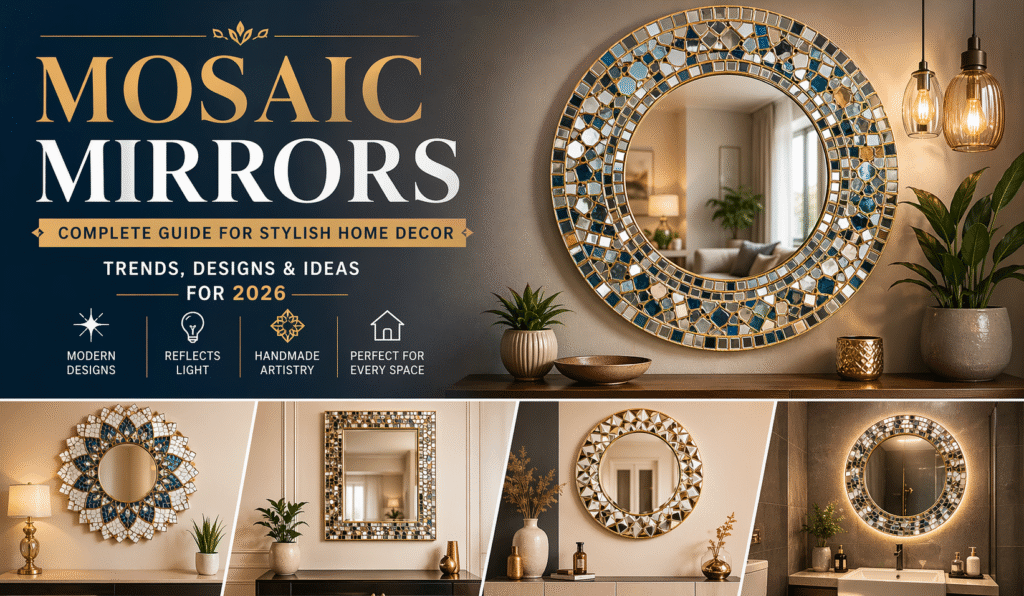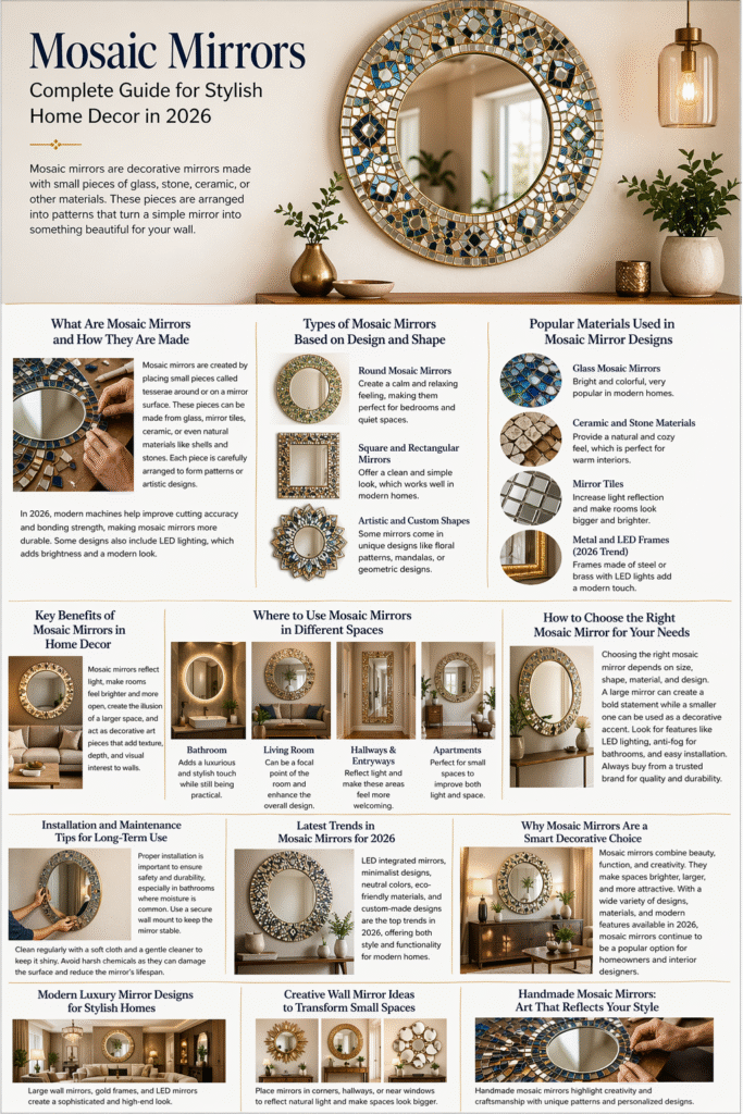 Mosaic mirrors are decorative mirrors made with small pieces of glass, stone, ceramic, or other materials. These pieces are arranged into patterns that turn a simple mirror into something beautiful for your wall. In 2026, mosaic mirrors are becoming more popular because they combine modern design with traditional handmade style. Many people use mirrors to make their homes look brighter, bigger, and more stylish. These mirrors are not just for looking at yourself, they also add personality and charm to any room.