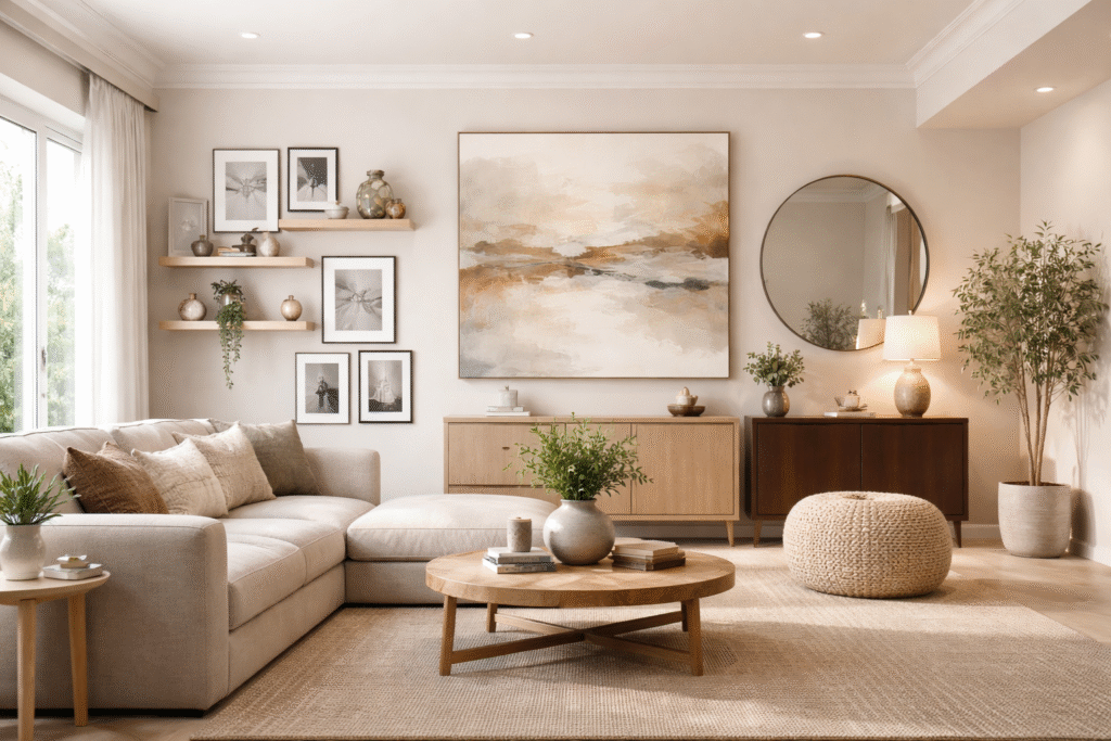 A large living room wall can feel empty and hard to style. It often looks too plain or too big for small decor items. This makes the space feel cold or unfinished. At the same time, adding too many items can make the wall look messy and crowded.